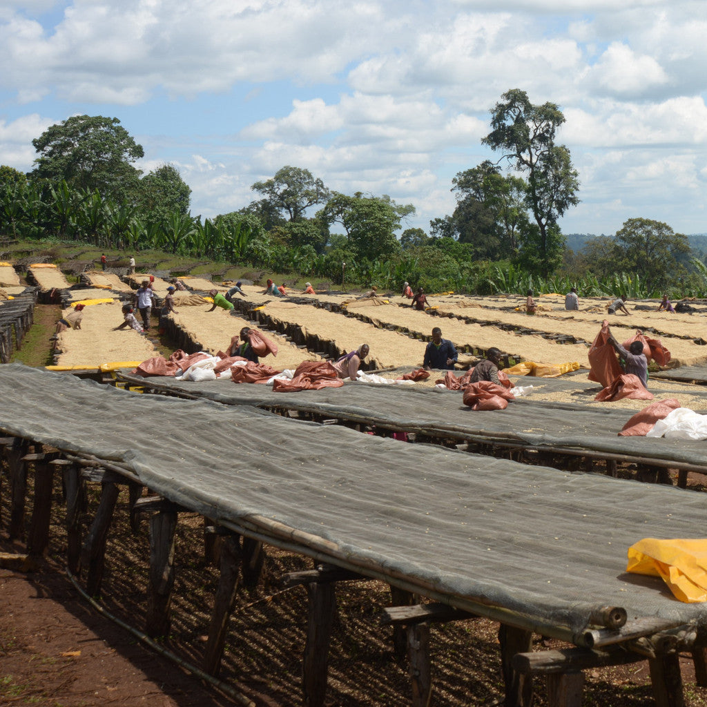 At Sasaba washing station, the red cherries are produced in the area surrounding the washing station and are collected from late September until December. Cherries are processed on-site and fermented for about 48-72 hours before they are placed on the drying beds for about 7-8 days. About 350-400 drying-beds are present at the washing station.
